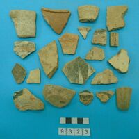 - and painted medium and fine wares. Featuring a glazed sherd in creamy-white with green decoration. Red and brown slip decoration. Black wash. White on black and polychrome decoration. Includes a tripod leg of this oval section with a raised rib.
