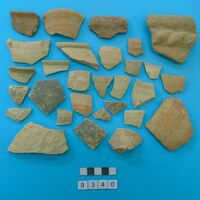 and painted medium and fine wares. Featuring black wash decoration. Foliate decoration in red slip. Rope moulded decoration. Applique finger marks in wet clay.