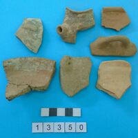 - and painted fine wares. Featuring red and brown slip decoration. Red and black washed sherds. Includes a sherd with an eye pellet decoration