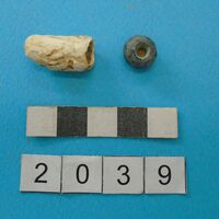 - Flat spherical steatite bead with a single perforation. Natural tubular limestone concretion