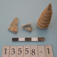 - One decorated bodysherd; one base blue glazed fragment; a finial clay possibly attached to a vessel.