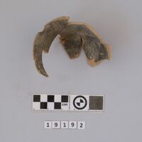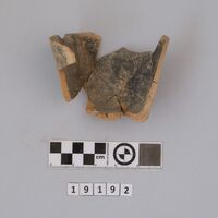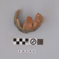 - Fully preserved profile of a straight-sided cup with bevelled base and ridges. Red to brown painting on the outside and brownish painting on the inside.