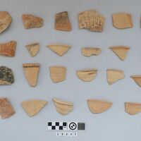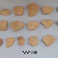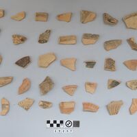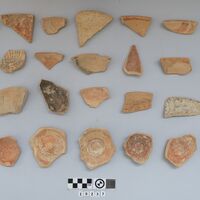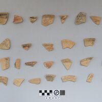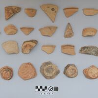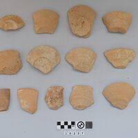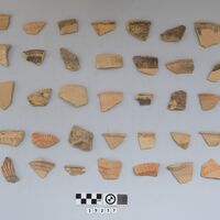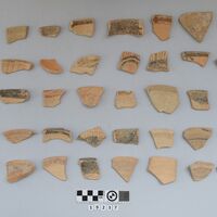 - shallow bowls (some with horn-like handles) and dishes. Decorations include monochrome painting