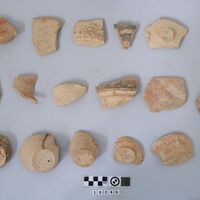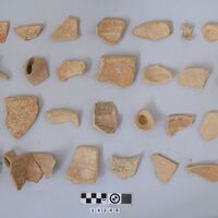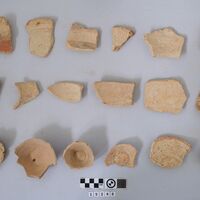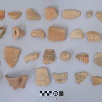 - cooking pots and one jar with relief decorations (handles?). Decorations include monochrome