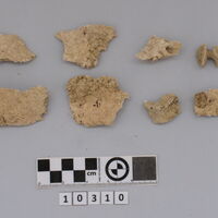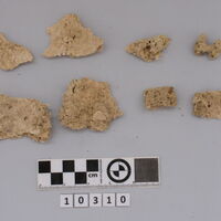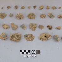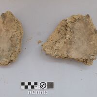- Several fragments of wall-painting with traces of blue and red painting. Two of them are big and covered with a thin layer (restoration ?). Also 8 fragments of human skull.