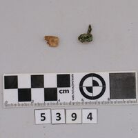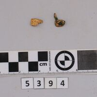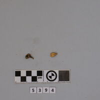 - Two fragments of jewellery. One is a gold bead depicting a double argonaut. The other one is a bronze pin (?) covered with gold leaf.
