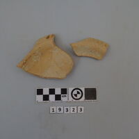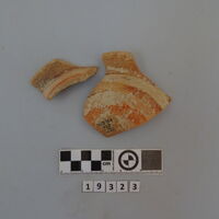 - Two fragments of a ledge bowl decorated with dark and red bands on the outside.