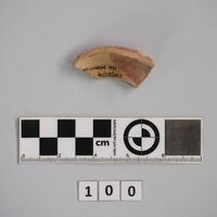- Fragment of rim of lamp and root of nozzle. Thick red slip. Burnt at core.