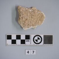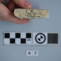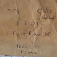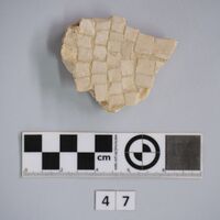 - Fragment of mosaic. Upper surface with mosaic tesserae made of stone (marble?). Lower part with mortar visible.