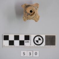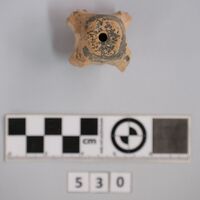 - Fragment of chariot model. Hub of a wheel broken off. Traces of black paint on both sides.