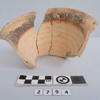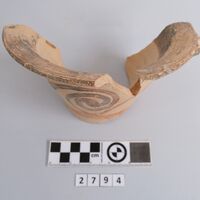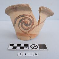 - Upper part of a thick rhyton. One lug preserved on the rim. Brown band on the rim. Running spirals.