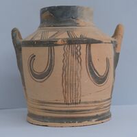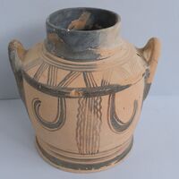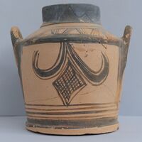 - Pyxis with high neck and sloping shoulder. The raised horizontal handles start from the middle of the cylindrical body and ascend vertically to a point above the shoulder. Its design on the one face depicts pendent loops either side of a central group of vertical lines with a wavy border; the other face omits the central division