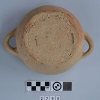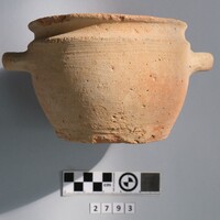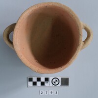 - Small squat jar with both horizontal handles preserved and a concave rim. Orangey pinkish fabric. Intact.