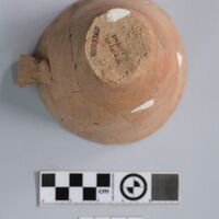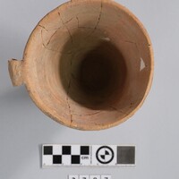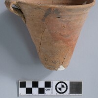 - one vertical handle laid on at rim. Partly recomposed. Surface ridged inside and in handle zone outside. Fired with mottled patches.