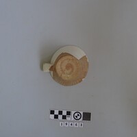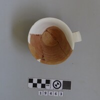 - One incomplete straight-sided cup restored with plaster. Red decorations including bands and ripples.