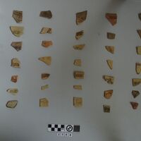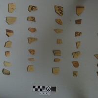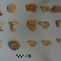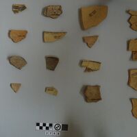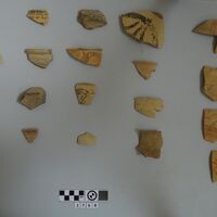 - a lug and one base of an amphora / lid of pithos? Decorations include monochrome black