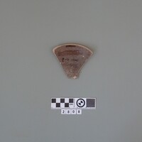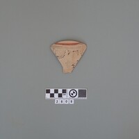 - Fragment of a vase featuring bichrome bands and a depiction of horns of consecration holding a branch.