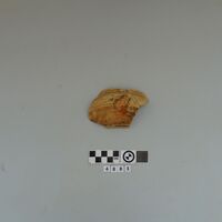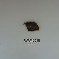 - One skyphos fragment recomposed (four smaller fragments). Complete profile with one stump of horizontal cylindrical handle. Soft pinkish micaceous clay.Lustrous black glaze inside