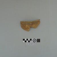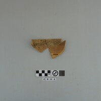 - recomposed: nearly a quarter rim with roots of horizontal handle. Soft orange clay dipped in dull red-brown glaze. Handle rose at a very low angle. D.c. 0.015 m.