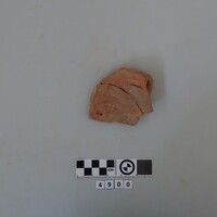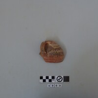 - Two cup fragments recomposed. Strap handle and scrap of rim-shoulder carinated. Hard red micaceous clay. White paint decoration directly applied to clay (lines and bands). D. of rim c. 0.115 m.