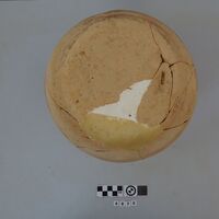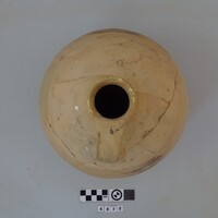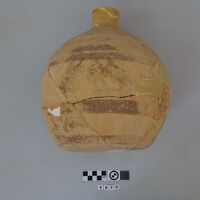 - cream slip. Globular with wide flat bottom. Flaking dark brown paint for encircling bands. From a stripe at the base of the neck