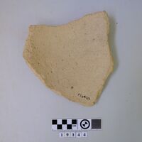 Sherd of a jar with dark-on-light bands and circles.