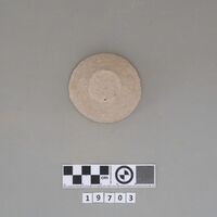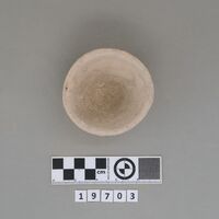 - Complete conical cup with soot deposit on the rim indicating a use as lamp.
