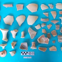 - Fine and semi fine ware. Red and black paint. Decorations include multile hooked stem