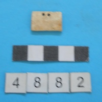 - Rectangular strip. Two holes pierced near one long side; a break at the opposite side. Deposit H.