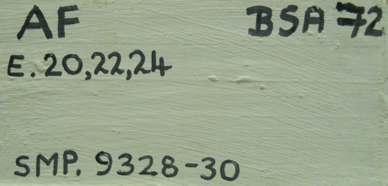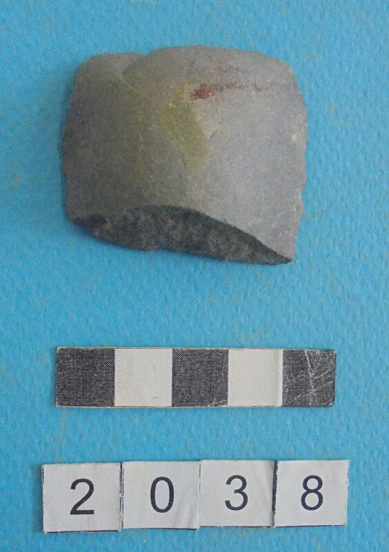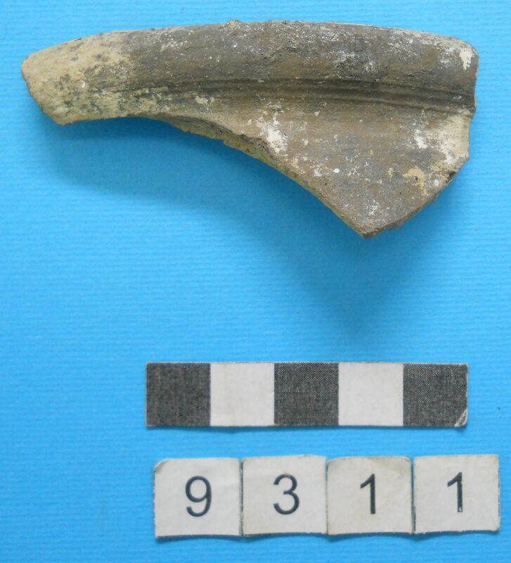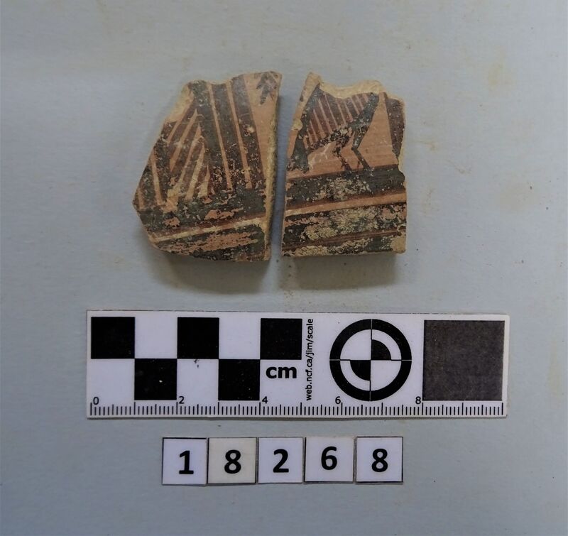 Two fragments from same pot? One wall fragment with red slip exterior. One fragment with grooved rim and red slip on interior and exterior.