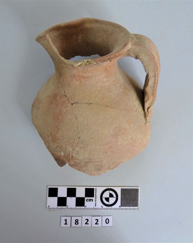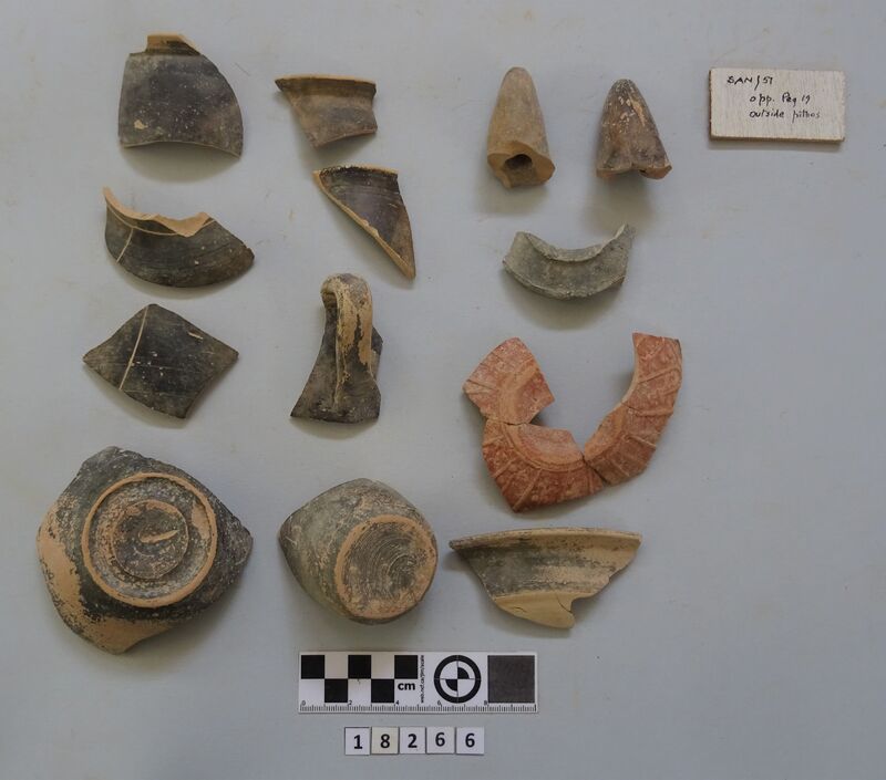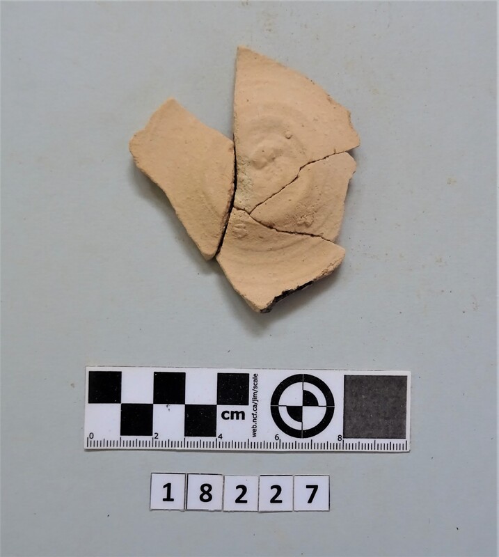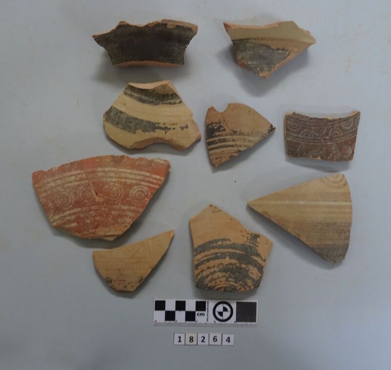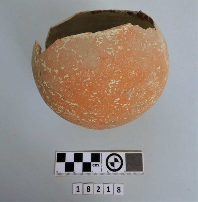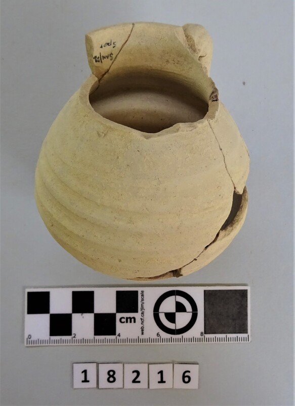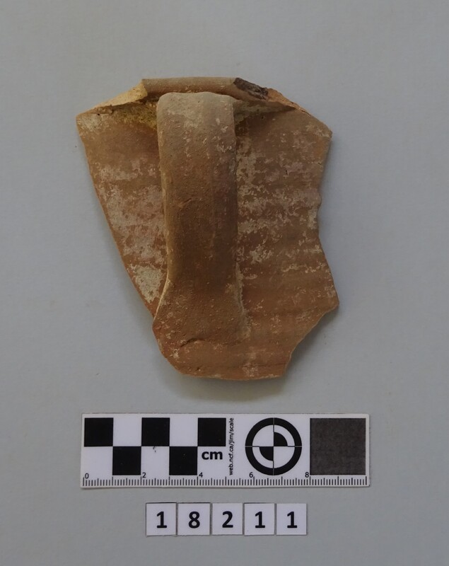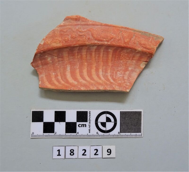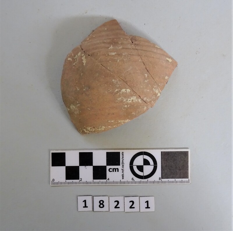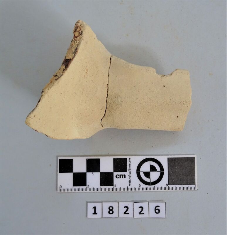 Neck and upper shoulder fragment of large vessel. Red and white slip linear decoration of neck; on shoulder