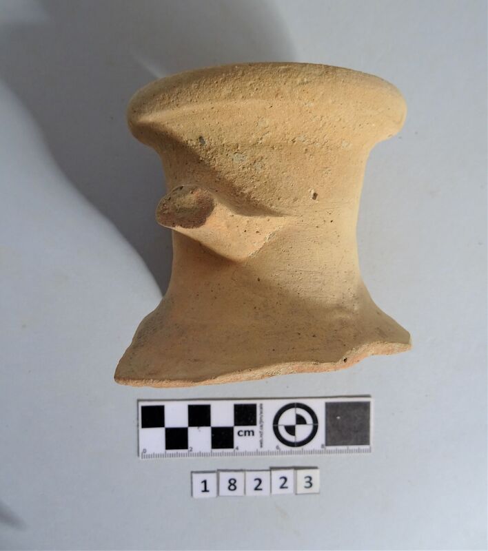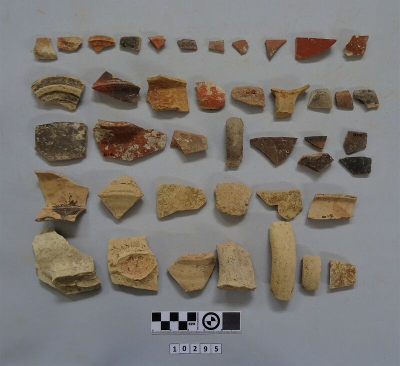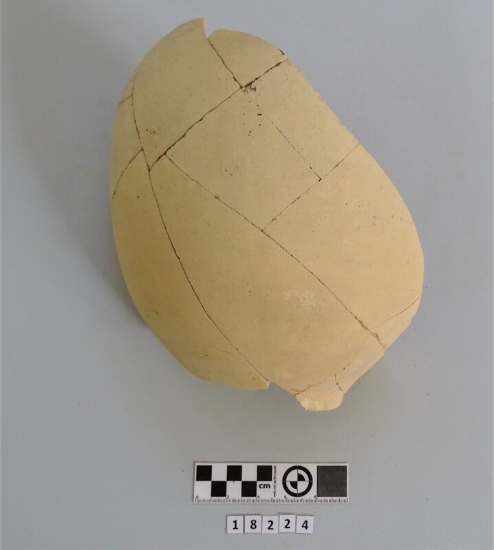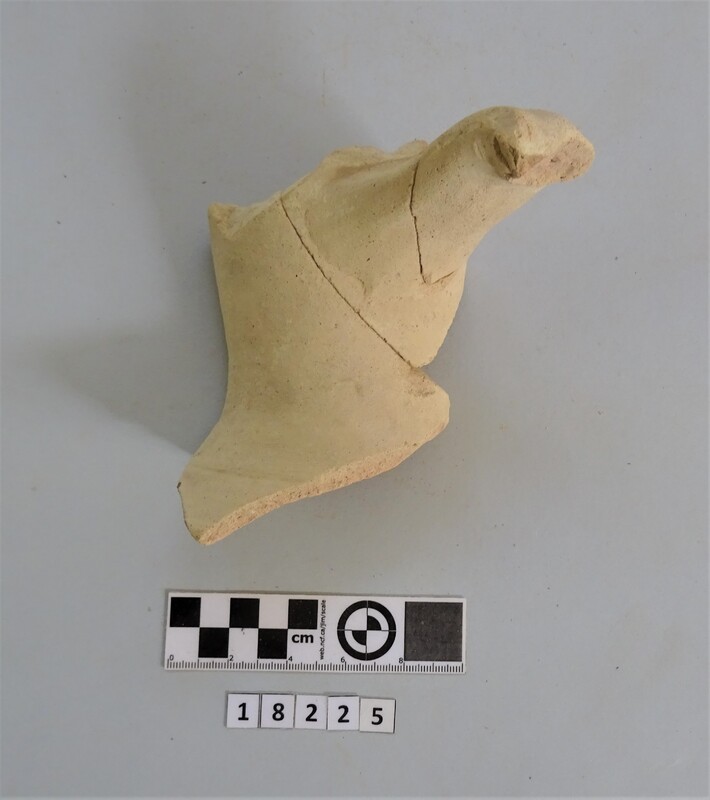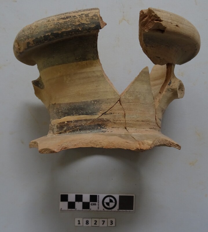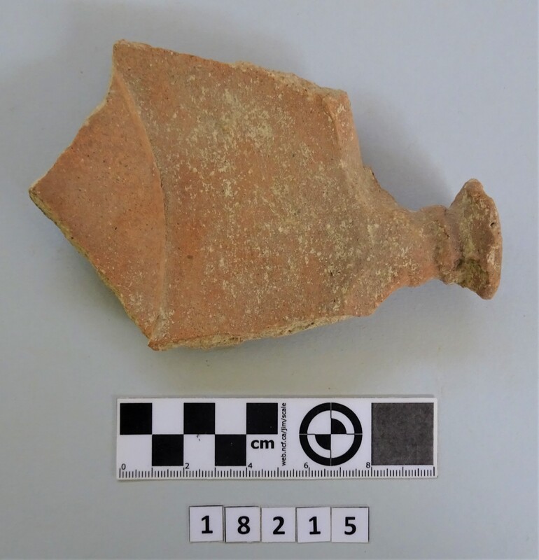 Fragment of a one-handled frying-pan. Handle and part of the base preserved. Firing traces on the base. Hollow handle. Dated between 2nd and 3rd cent. A.D.