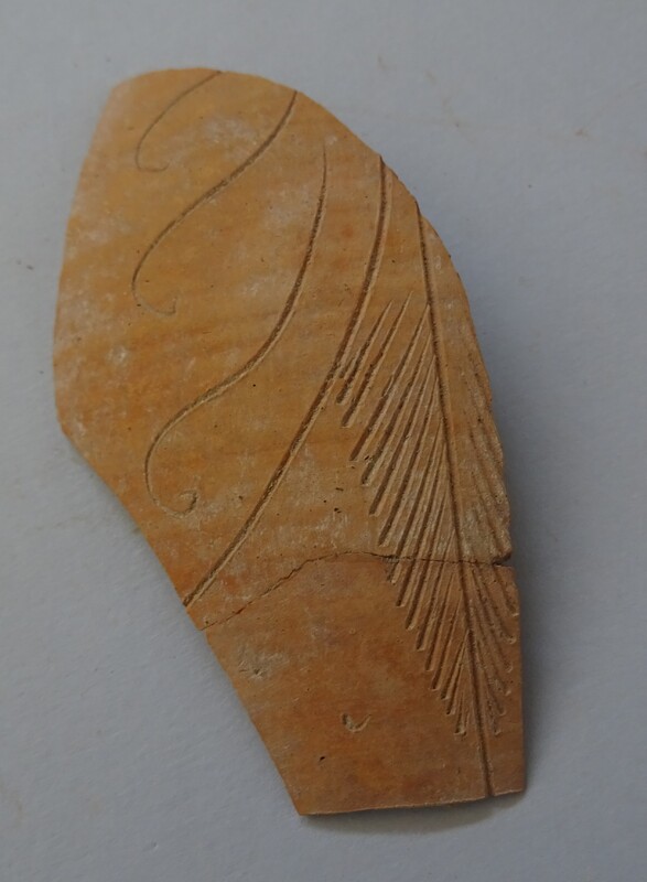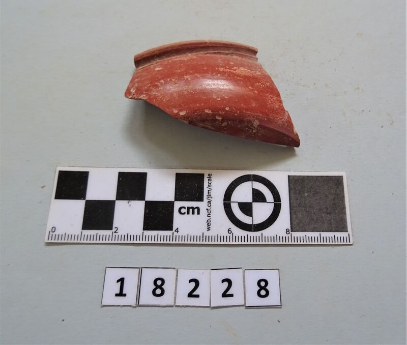 Fragment of thin-walled bowl. Interior: red slip. Upper surface of rim and exterior: black slip. On middle of surviving wall cornucopia and grapes(?)