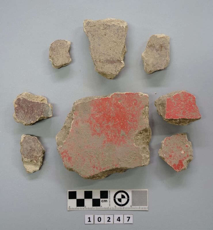 Several pieces of painted plaster. Red