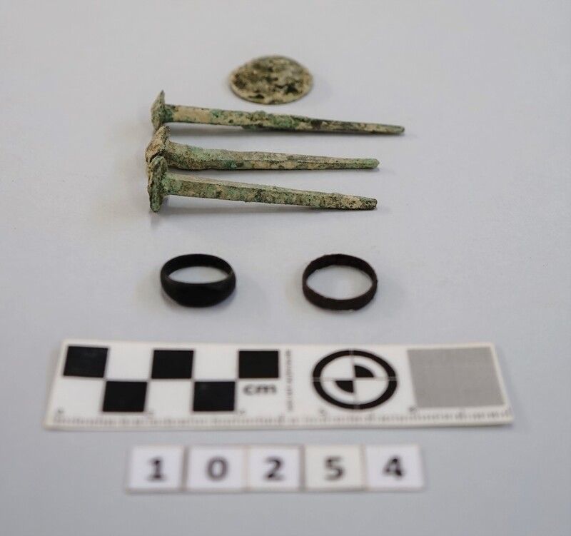 Three nails. One miniature shield. Two rings. Other fragments of shield (?).