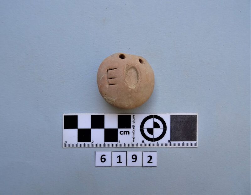 A circular loomweight with a rounded surface