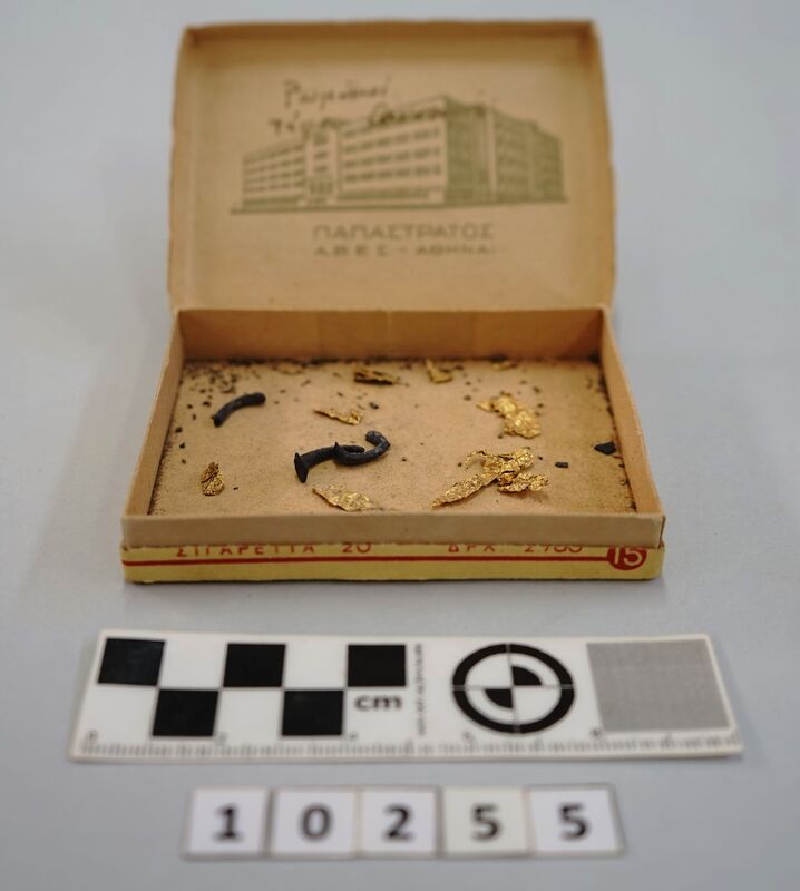 Fragments of gold foil (crumpled) and bronze.