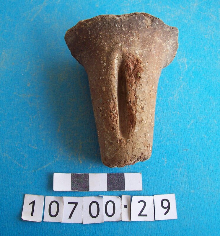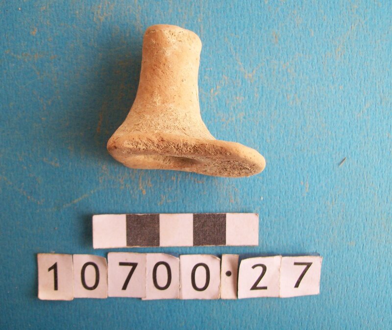 Tripod cooking pot. Part of one leg. Coarse