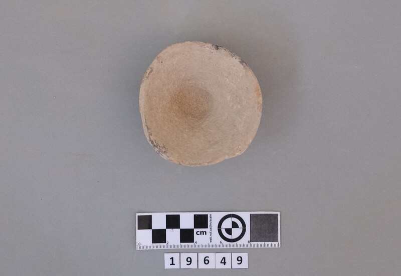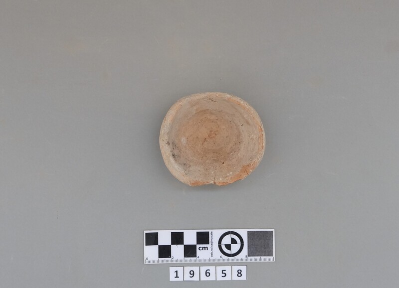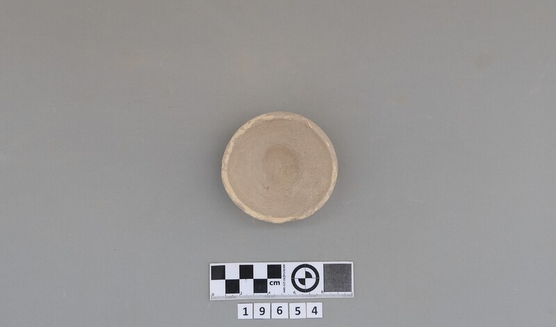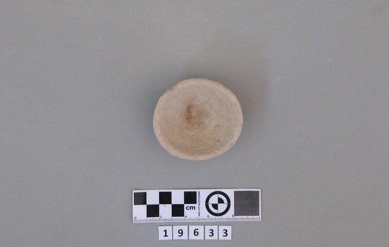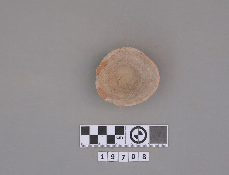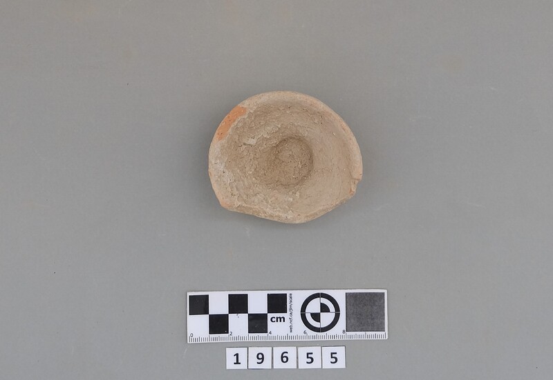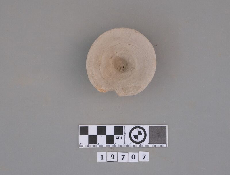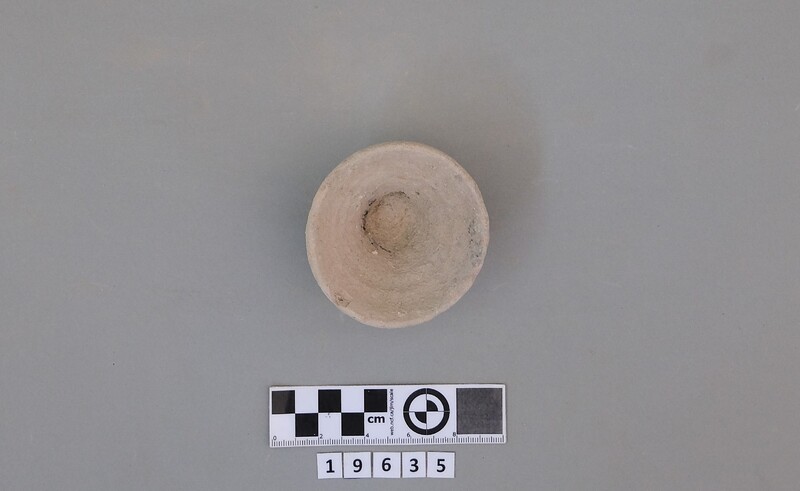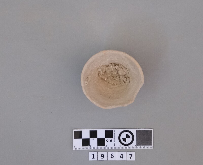 Complete conical cup with soot deposit on the rim indicating a use as lamp.