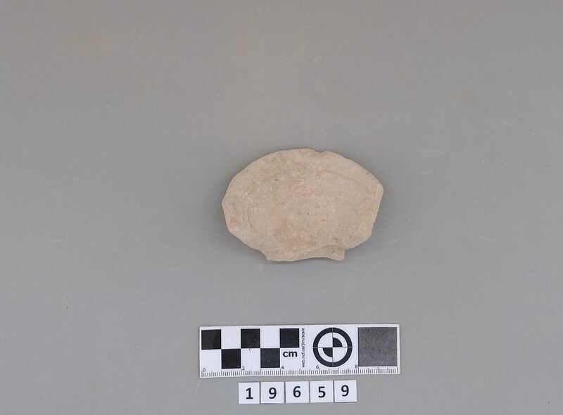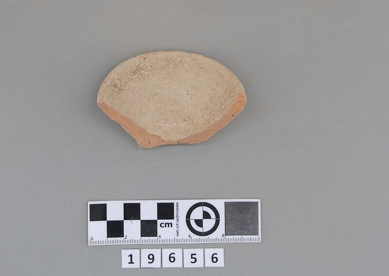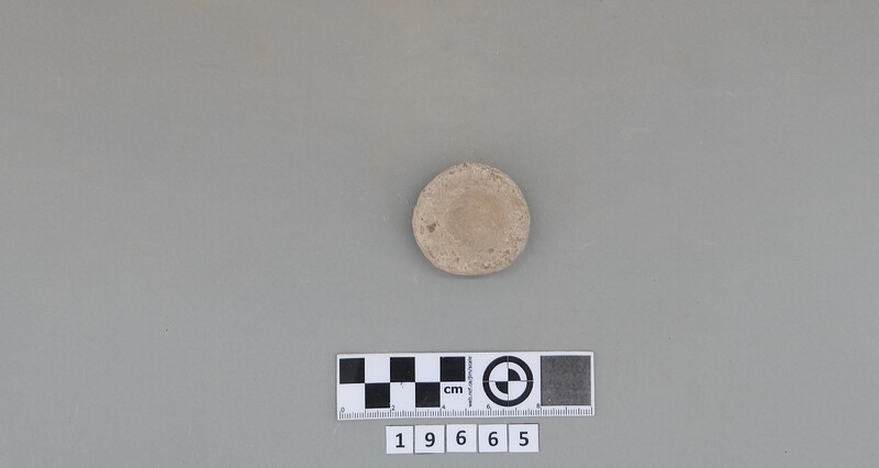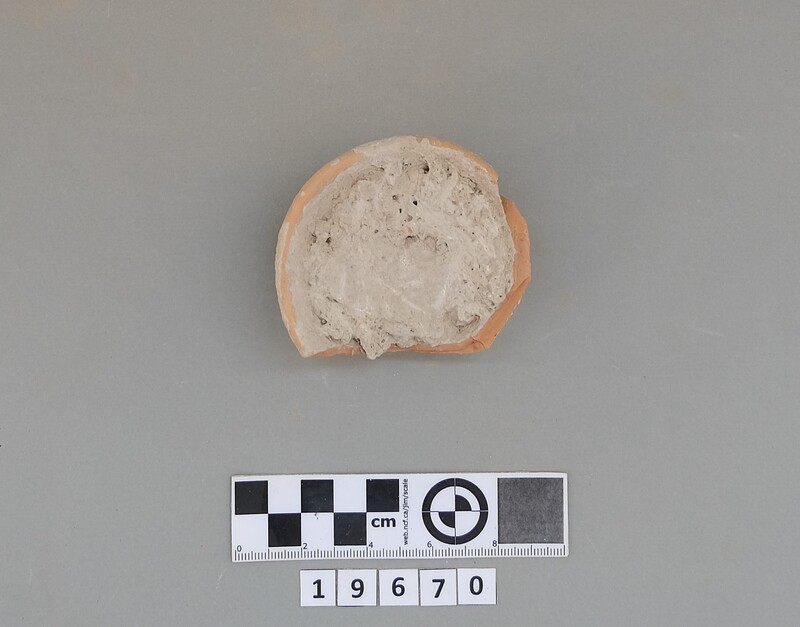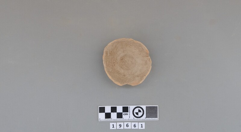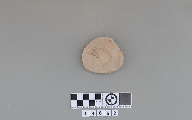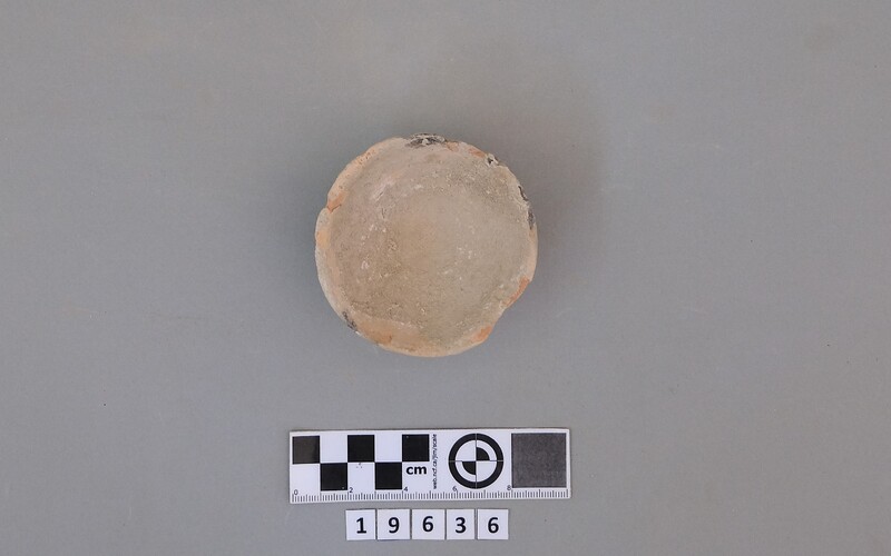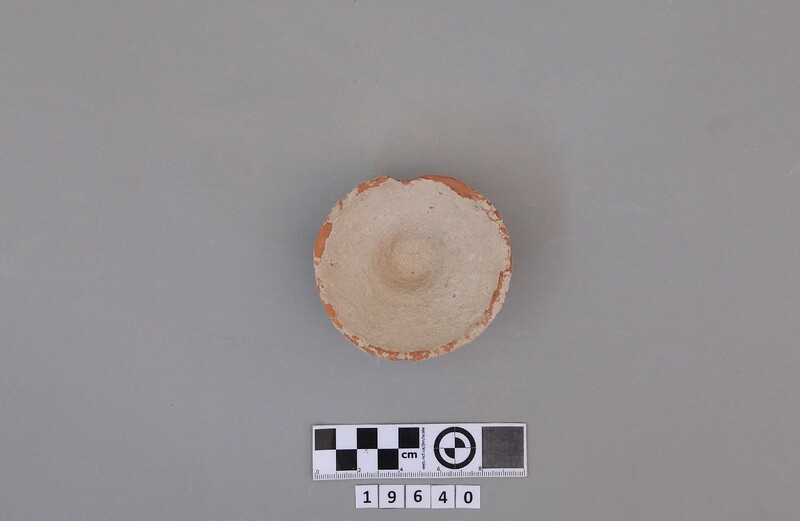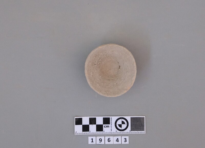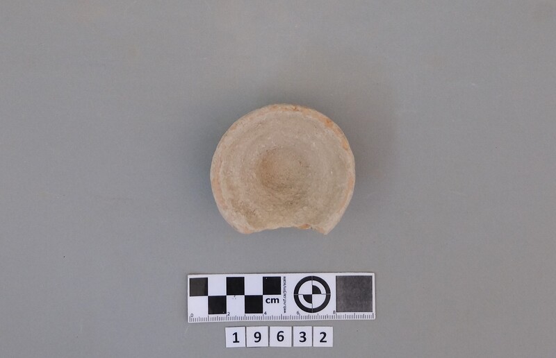 Complete conical cup with soot deposit on the rim indicating a use as lamp.