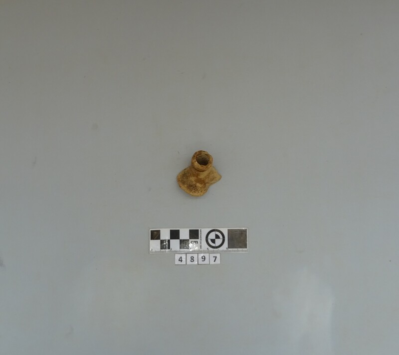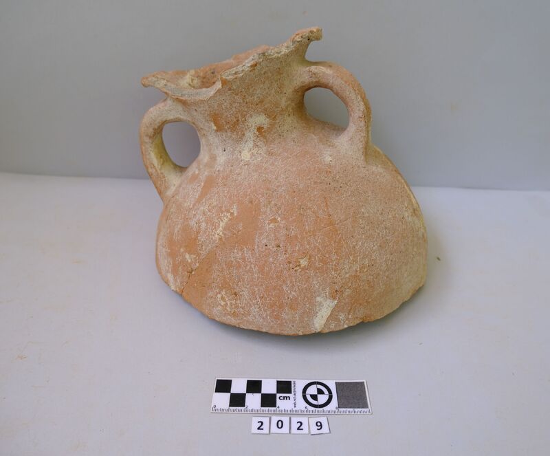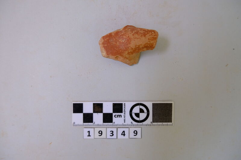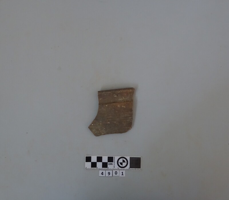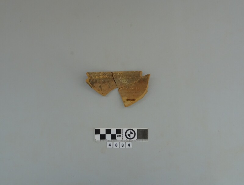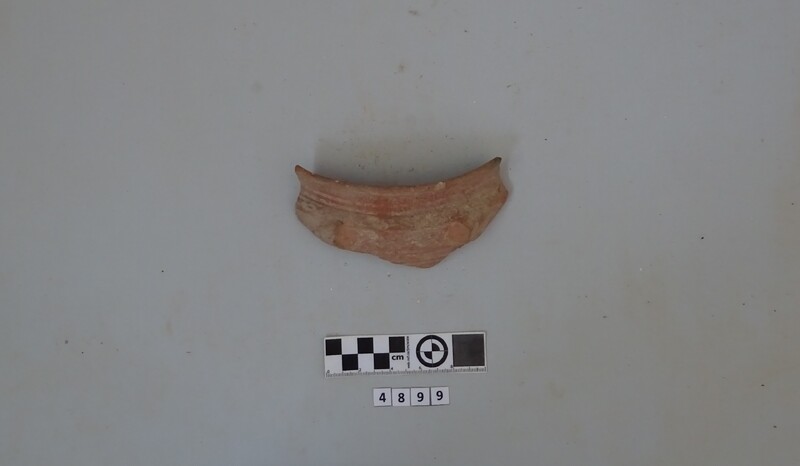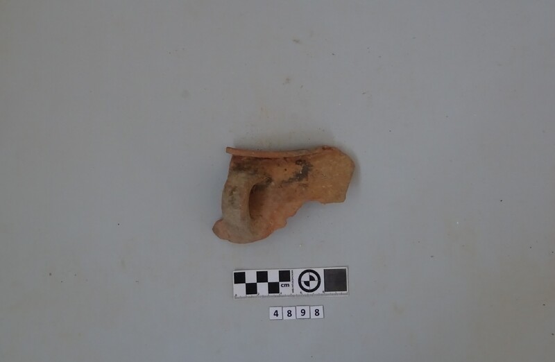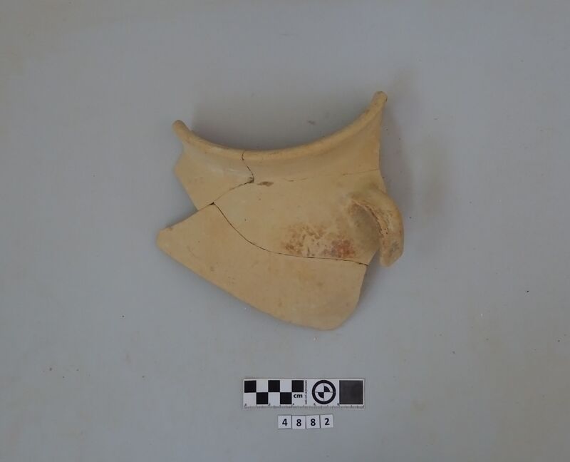 Rim fragment of a cooking pot. Hard red micaceous clay with white and grey impurities. Wide vertical strap handle. Incised decorations (lines and zig-zag). D. of rim c. 0.19 m.