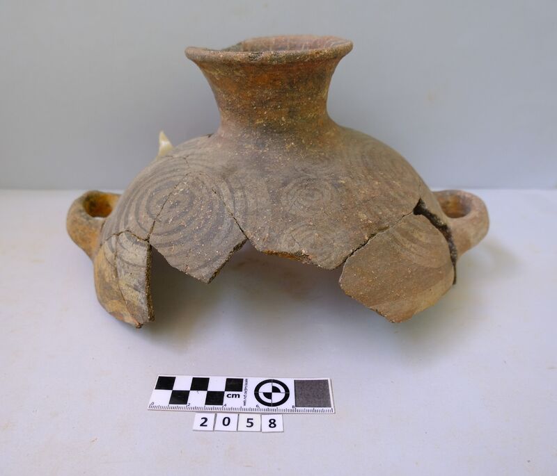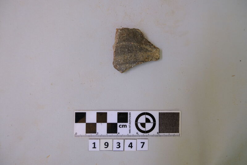 Rim fragment from a carinated bowl. Hard grey micaceous clay with impurities. Roots of horizontal handle and incised decorations (lines and waves). D. of rim c. 0.18 m.