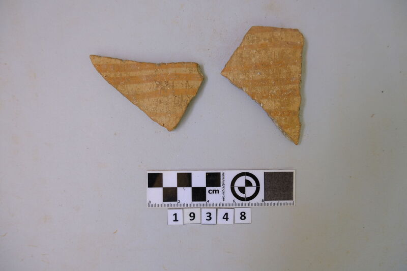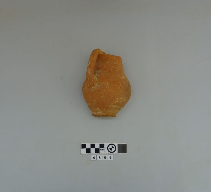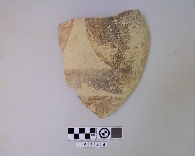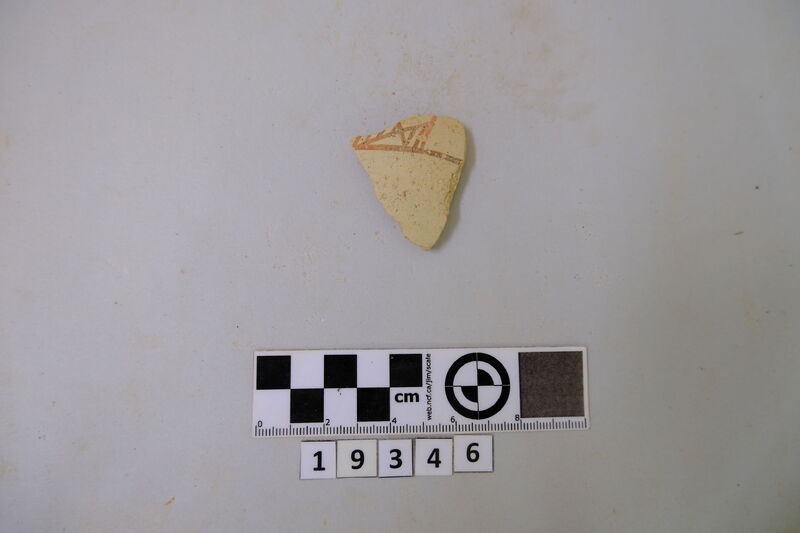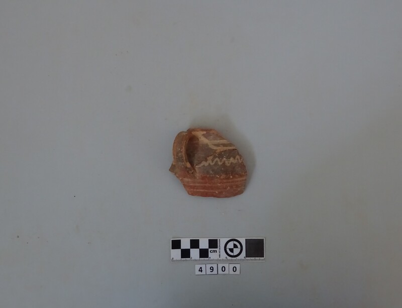 Two cup fragments recomposed. Strap handle and scrap of rim-shoulder carinated. Hard red micaceous clay. White paint decoration directly applied to clay (lines and bands). D. of rim c. 0.115 m.