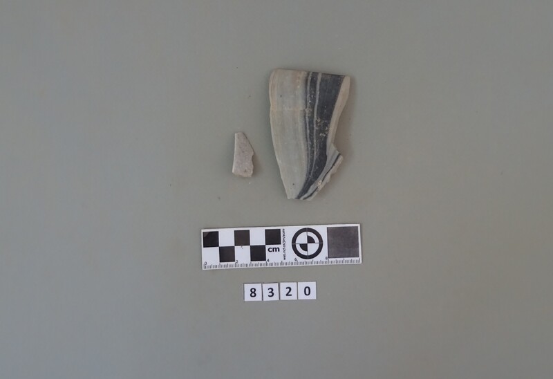 Rim sherd from bowl. Dark to red brown paint for linear decoration.