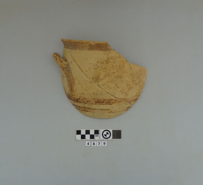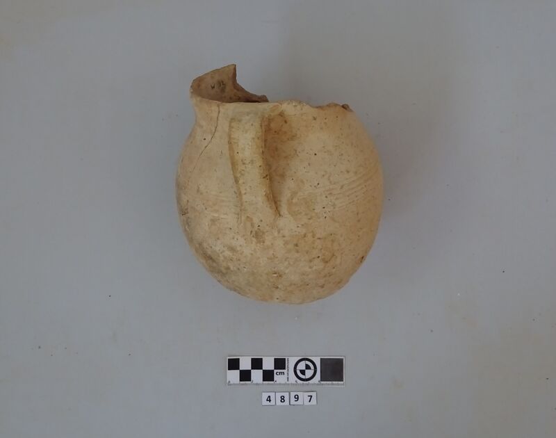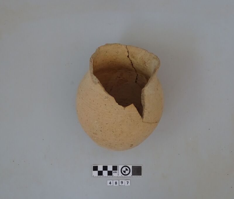 Recomposed incomplete jug; half of the rim and adjacent missing. Pale pink clay