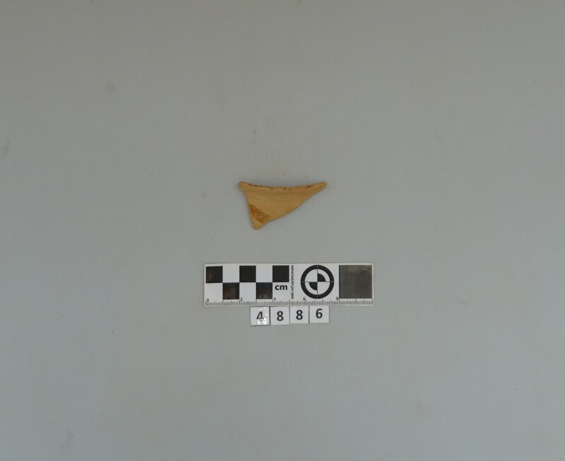 Cup fragment: rim sherd with outer handle rest. Soft buff clay