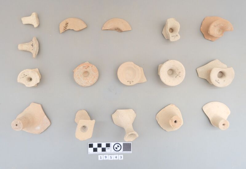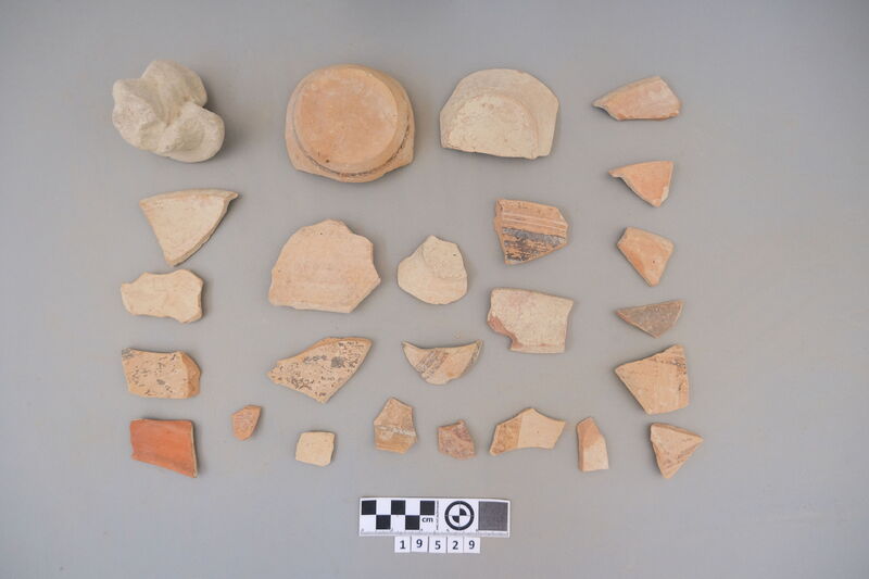 Sherds of kylixes and bowls. Decoration includes monochrome and dark-on-light painting (bands