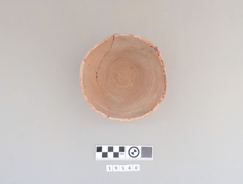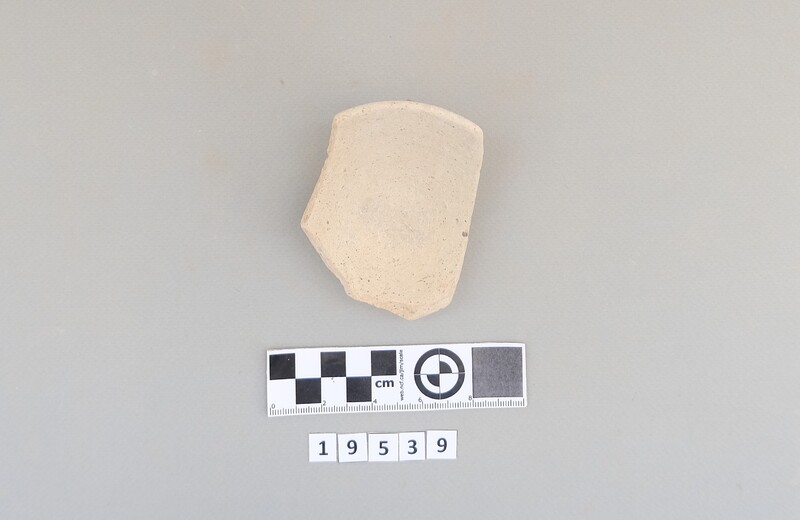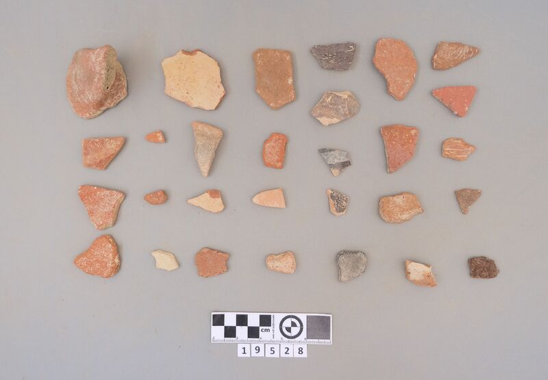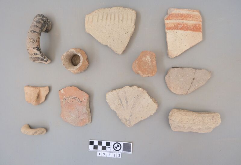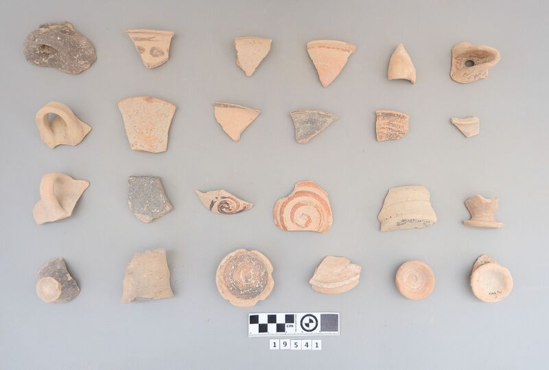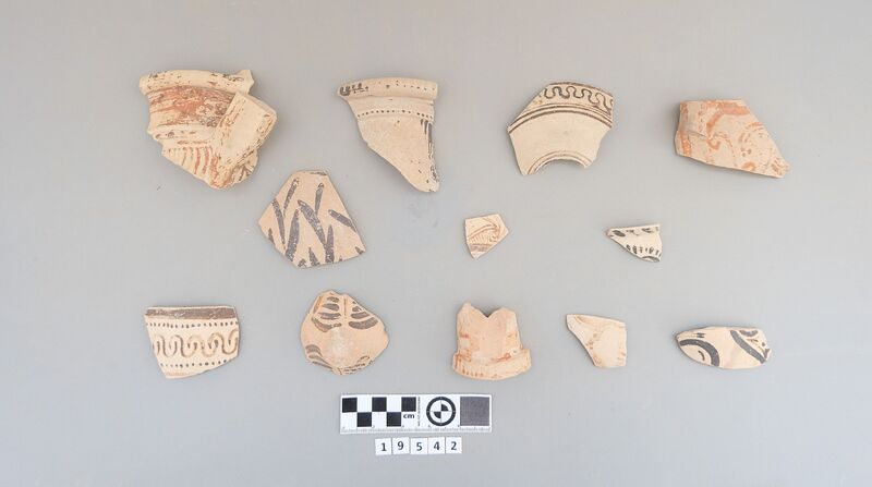 Sherds of various shapes including jars and cups (conical cup). Decoration includes dark-on-light painting (bands