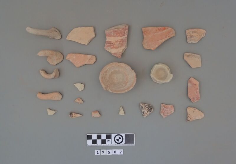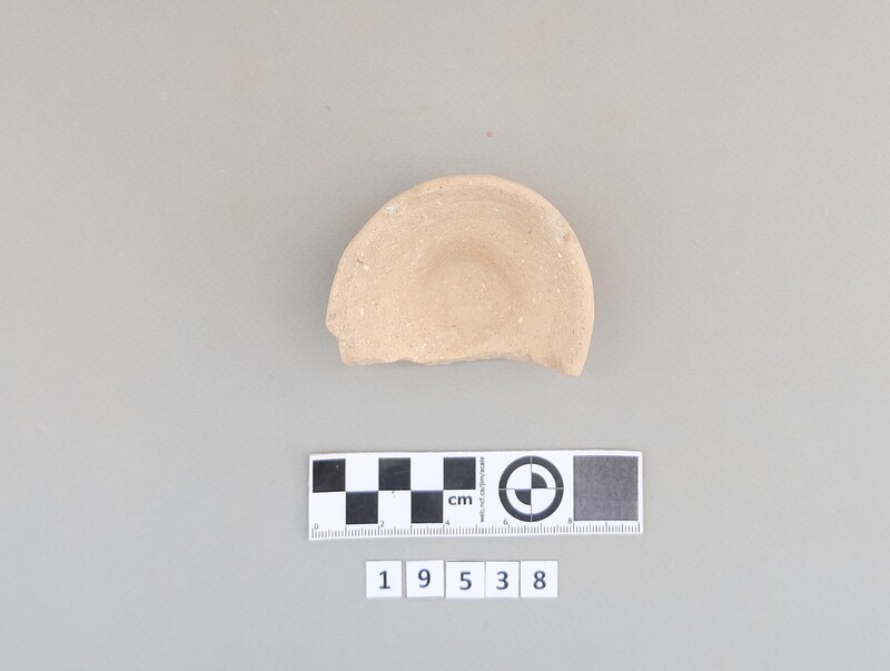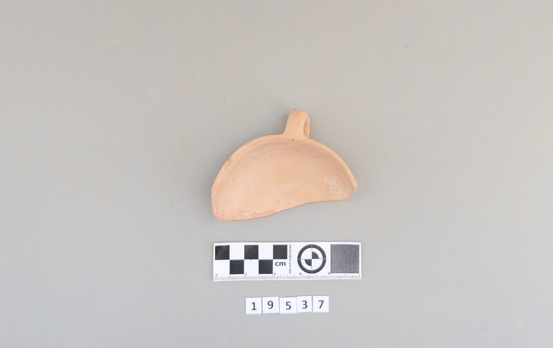 Half-preserved carinated cup in pinkish fabric with loop handle attached to the rim.