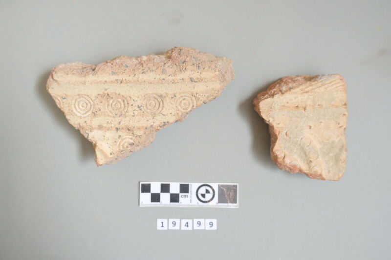 Two fragments of pithoi dated to the Iron Age. Imprints and incisions at their surface (concentric circles